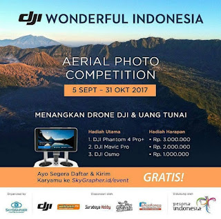 Jika iya, teman-teman wajib tahu nih jika saat ini SkyGrapher kali ini ngadain kontes foto yang disponsori oleh Dji, Wellcomm, Surabaya Hobby, RChobby Jakarta, plaza kamera dan didukung oleh Pesona Indonesia dengan tema DJI WONDERFUL INDONESIA. Menangkan hadiah Drone DJI untuk tiga juara utama dan uang tunai untuk juara harapan!